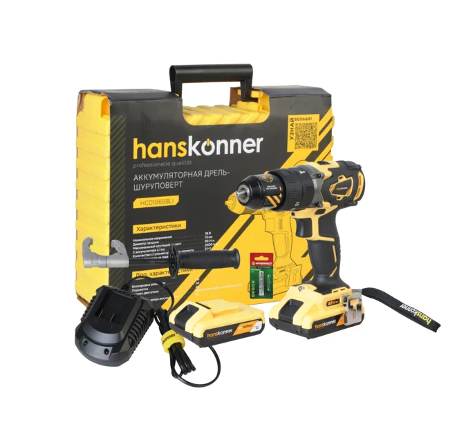 Установка на модели усиленного цельнометаллического патрона с максимальным диаметром захвата 13 мм позволила значительно расширить набор используемой оснастки. Инструмент обладает максимально сбалансированной компоновкой: небольшая толщина корпуса и рукояти позволяют его эффективное использование в условиях с трудным доступом, а нейтральный центр тяжести и обилие прорезиненных противоскользящих поверхностей способствуют надежному хвату и лучшему контролю в процессе работы. К особенностям Hanskonner HCD1865BLI Unibattery стоит отнести функцию блокировки вала шпинделя для удобной замена оснастки одной рукой, электронный тормоз выбега двигателя, гарантирующий мгновенную остановку патрона, а также LED-подсветку рабочей зоны с нижним размещением, что предполагает более эффективный охват рабочей зоны и исключение теней от патрона и оснастки. При необходимости, подсветка может включаться принудительно кратковременным нажатием на пусковую клавишу. Для удобства пользователя предусмотрена специальная зацепная скоба крепления на пояс, держатель для бит, а также страховочный ремешок на руку. Шуруповерт штатно комплектуется парой литий-ионных (Li-ion) аккумуляторов емкостью 2.4 Ач с индикацией остаточного заряда, импульсным зарядным устройством с функцией быстрой зарядки (0 – 100% – 60 мин, 0 – 80% – 35 мин), двухсторонней битой, а также пластиковым кейсом для удобства хранения и транспортировки.