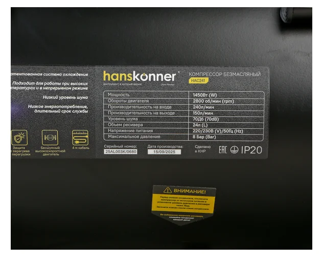 Компрессор воздушный безмасляный Hanskonner 1450 Вт, 240л/мин, ресивер 24л, 8 бар HAC241
