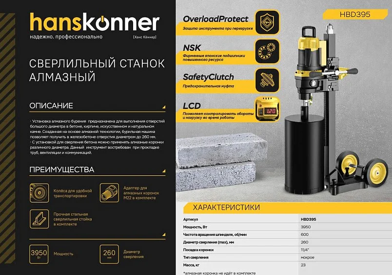 Сверлильный станок алмазный Hanskonner! HBD395 PLATINUM