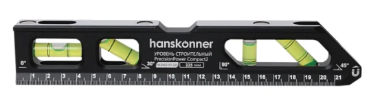 Уровень алюминиевый, 225мм, 4 колбы (0°,30°, 90°, 45° ), 3 магнита, hanskonner HK2015-07-225