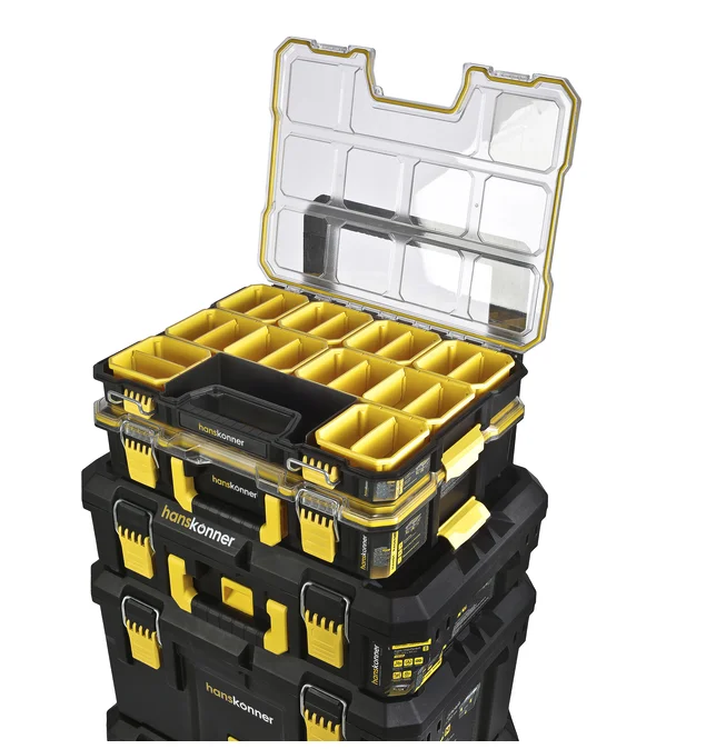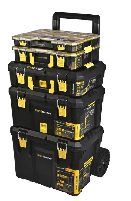 Модель Hanskit5 включает полную сборку из пяти ящиков: два прозрачных органайзера с крышками и разделительными лотками внутри, а также три полноценных ящика.
