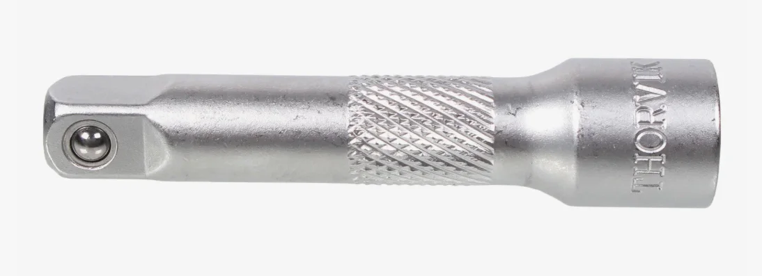 - Удлинитель служит переходным звеном между трещоткой (или воротком) и торцевой головкой, добавляя 75 мм вылета.