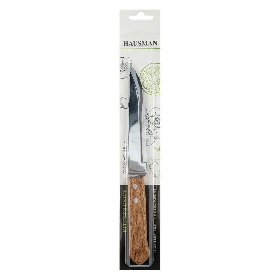 Нож универсальный большой Hausman 79160 длиной 295 мм используется для нарезки сыра, хлеба, мясной мякоти, а так же для чистки овощей и фруктов.ПреимуществаДолговечность и защита от плесени — рукоятка изготовлена из твердых пород древесины с масляной пропиткой, а лезвие — из нержавеющей стали, характеризующейся прочностью и стойкостью к коррозии.Высокое качество реза — лезвие ножа прошло закалку и лазерную заточку.
