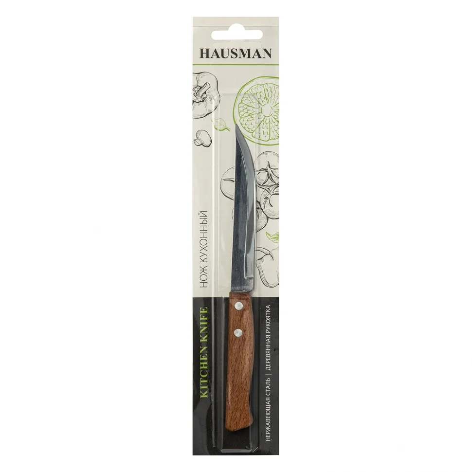 Нож универсальный малый Hausman 79156 длиной 210 мм используется для нарезки сыра, хлеба, мясной мякоти, а так же для чистки овощей и фруктов.ПреимуществаДолговечность и защита от плесени — рукоятка изготовлена из твердых пород древесины с масляной пропиткой, а лезвие — из нержавеющей стали, характеризующейся прочностью и стойкостью к коррозии.Высокое качество реза — лезвие ножа прошло закалку и лазерную заточку.