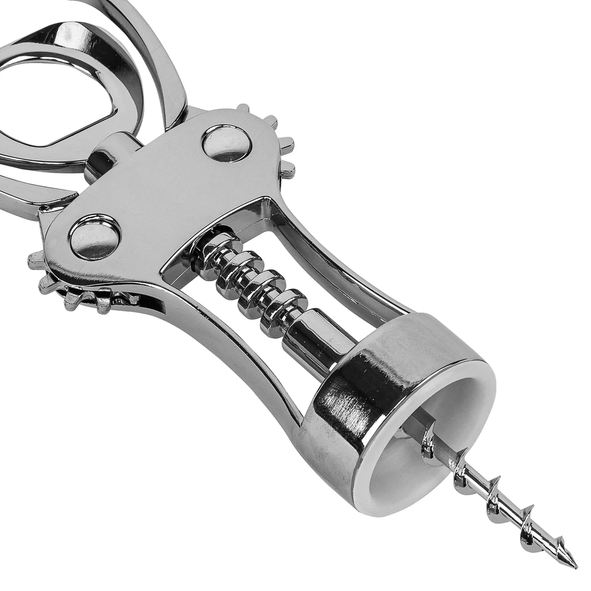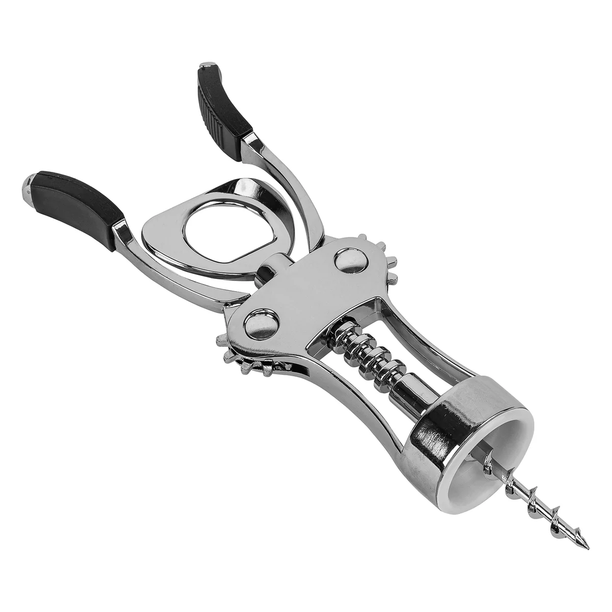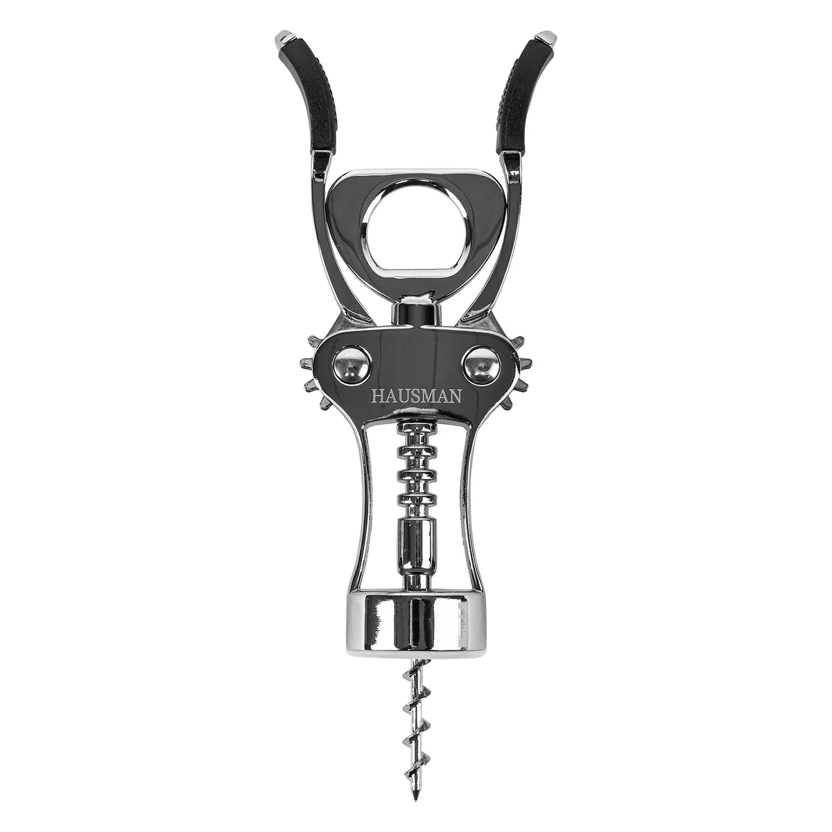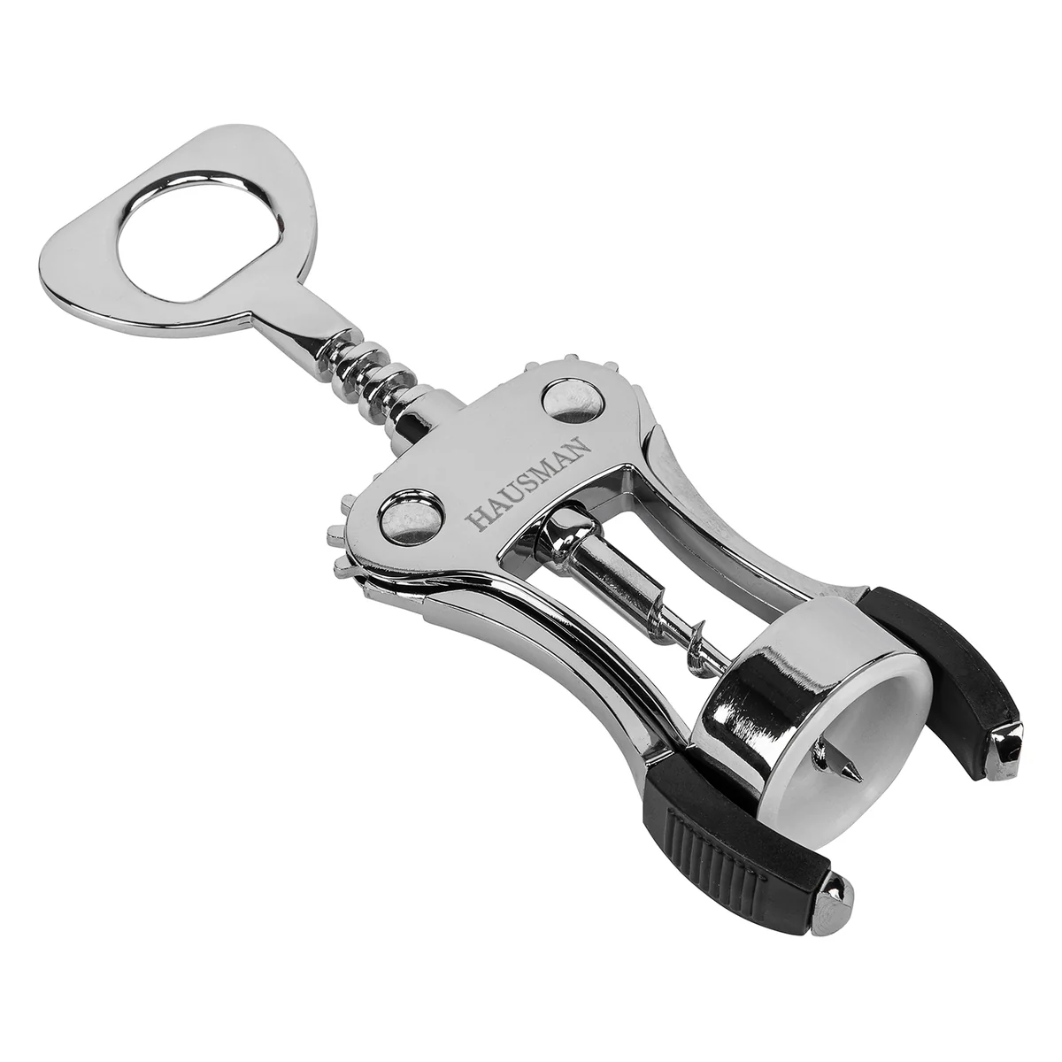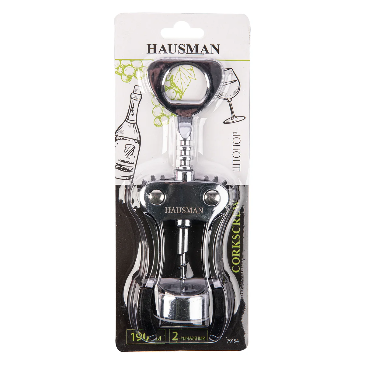 Двухрычажный штопор Hausman 79154 предназначен для откупоривания винных бутылок. Способ применения очень прост — аккуратно установите зажим на горлышке и поворачивайте спираль по часовой стрелке до тех пор, пока рычаги не начнут подниматься. Затем опустите рычаги вниз и снимите со спирали извлеченную пробку.ПреимуществаУниверсальность — штопор позволяет с легкостью откупорить винные бутылки с классическими пробками, расположенными внутри горлышка, и бутылки с металлическими пробками (пивные, с минеральной водой и т.д.).Прочность и устойчивость к коррозии — аксессуар выполнен из цинкового сплава.Эргономичность — рычаги с накладками из термопластичной резины и винтовой шнек с широкими гранями удобно ложатся в руки и не проскальзывают.Безопасность — двухрычажный механизм позволяет открыть бутылку быстро и без риска травмирования.