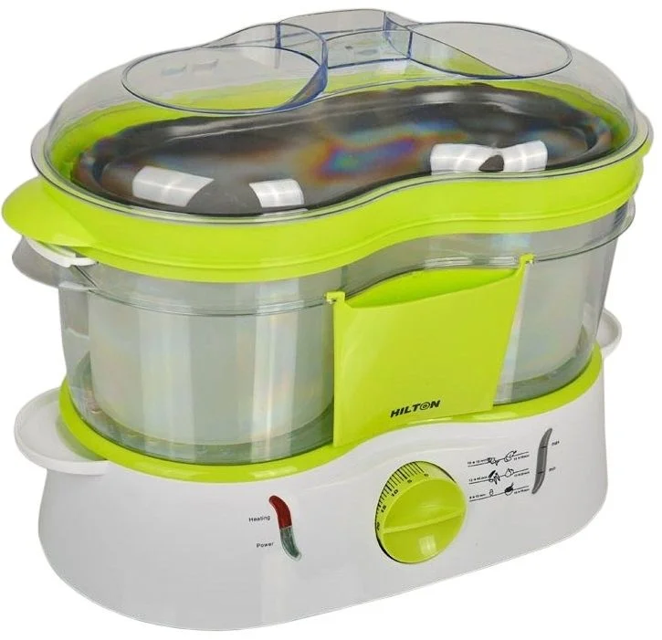 Данная модель оснащена тремя паровыми корзинами общим объемом 9 литров, что очень удобно. В каждой можно отдельно готовить различные блюда, и при этом не смешиваются запахи и вкусы. Мощность этой модели в 950 Вт рассчитана на быстрое приготовление различных продуктов. Функция "быстрый пар" за 15 секунд позволит быстро разморозить или приготовить блюдо. Для того что бы ускорить процесс готовки в резервуары можно доливать теплую воду.