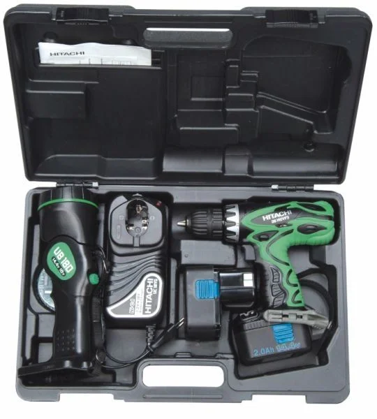 Аккумуляторная дрель-шуруповерт HITACHI DS14DVF3 - инструмент для сверления отверстий и работы с саморезами и шурупами по металлу, дереву или гипсокартону. 2 никель-кадмиевых аккумулятора 14,4 В., максимальные скорости: 400 и 1200 оборотов в минуту; быстрозажимной патрон, кейс, фонарик.