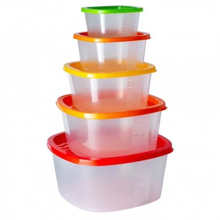 Набор состоит из пяти контейнеров разного объема, изготовленных из высококачественного пищевого пластика, который выдерживает температуру от -40°С до +110°С., не впитывают запахи и не изменяют цвет.