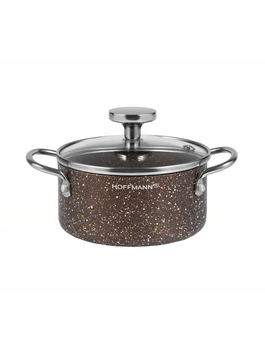Кастрюля из алюминия с антипригарным коричневым мраморным покрытием, крышка из закаленного стекла с отверстием для паровыпуска, эргономичные ручки, быстро нагревается, легко чистить, индукция. коричневая 14 см.( 0,8 л.)