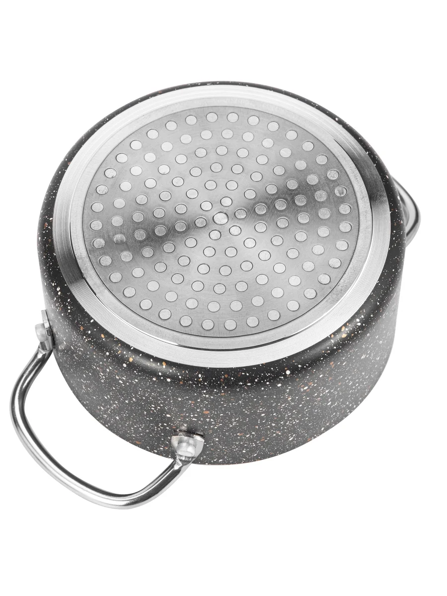 Кастрюля из алюминия с антипригарным черным мраморным покрытием, крышка из закаленного стекла с отверстием для паровыпуска, эргономичные ручки, быстро нагревается, легко чистить, индукция. черная 18 см.( 1,5 л.)