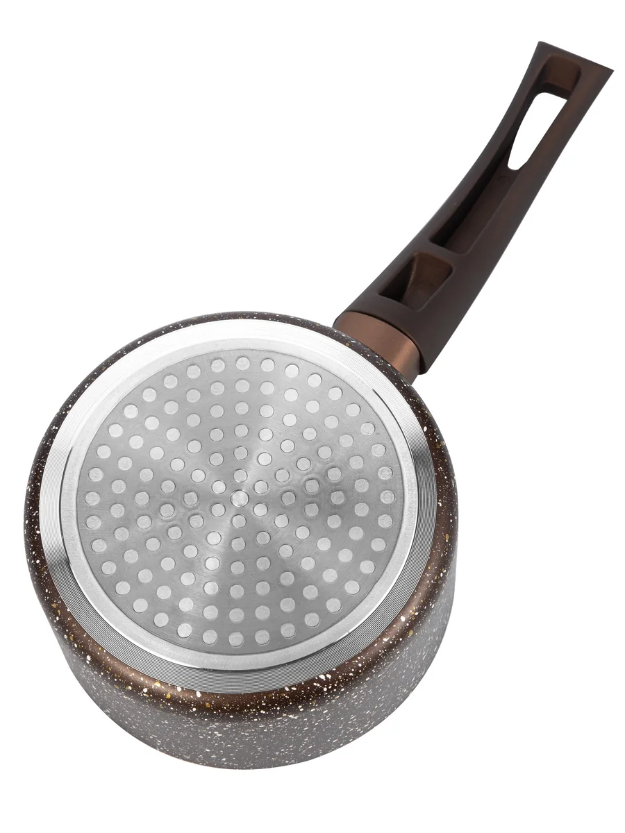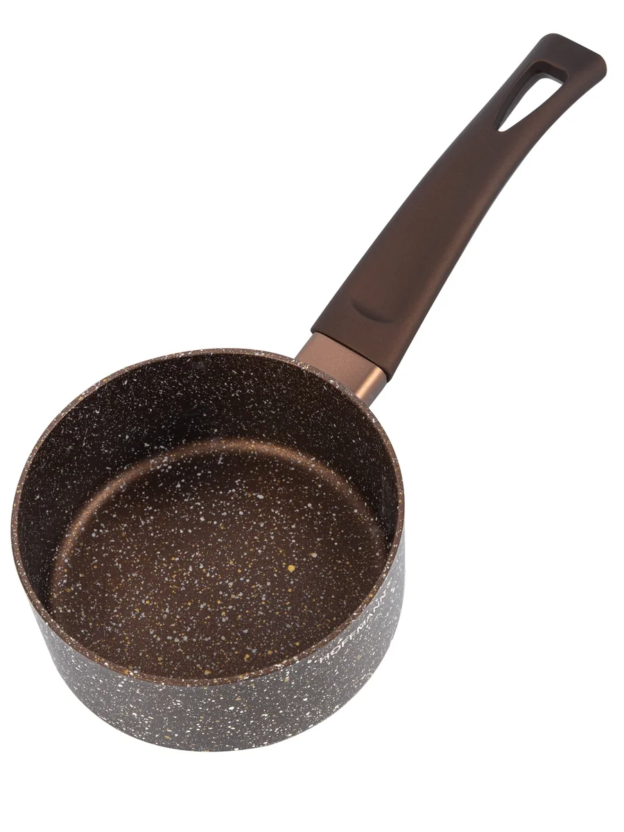 Ковш из алюминия с антипригарным мраморным покрытием. (16 см.), объем 1,2 литра быстро нагревается, легко чистить, коричневый, можно мыть в посудомоечной машине