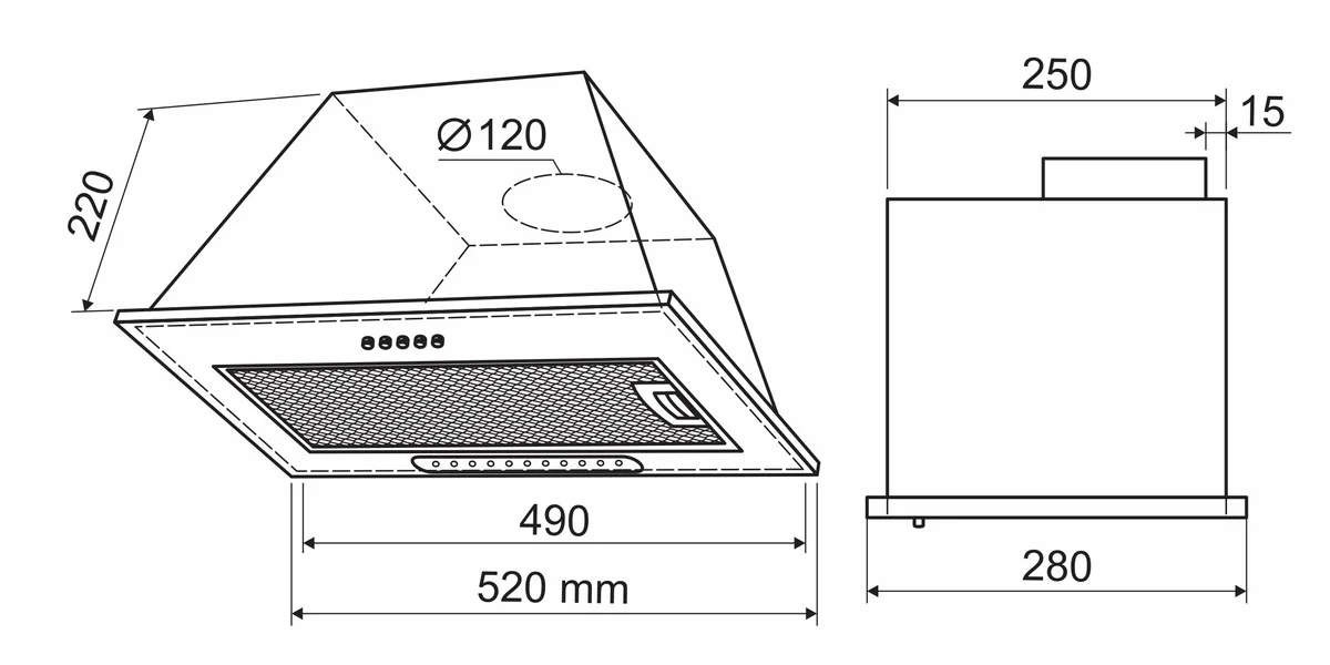 - Размер вытяжки 520х277х257 мм