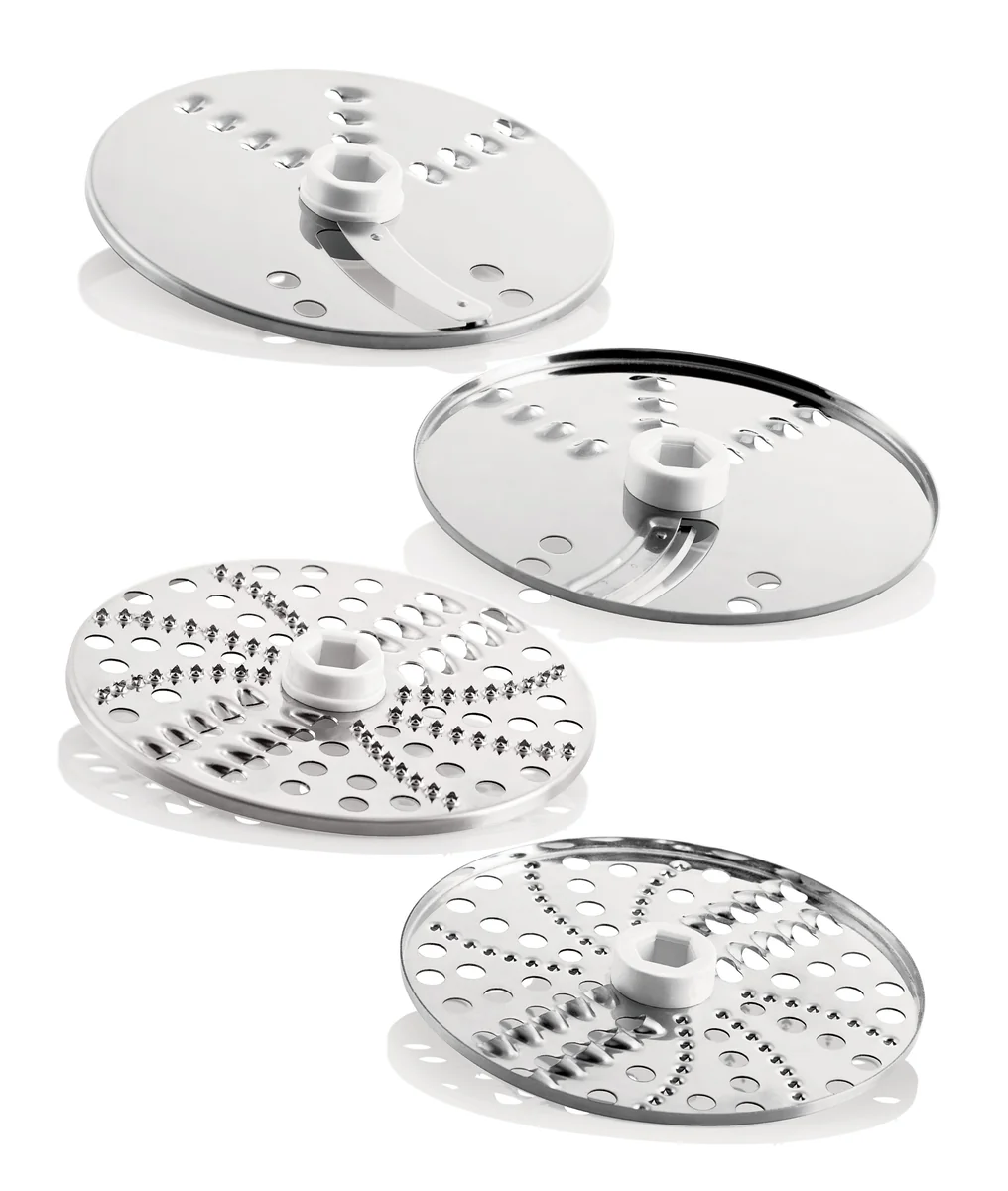 - Аксессуары: нож для измельчения, насадка для слайсов/терка мелкая, насадка для драников/терка крупная.