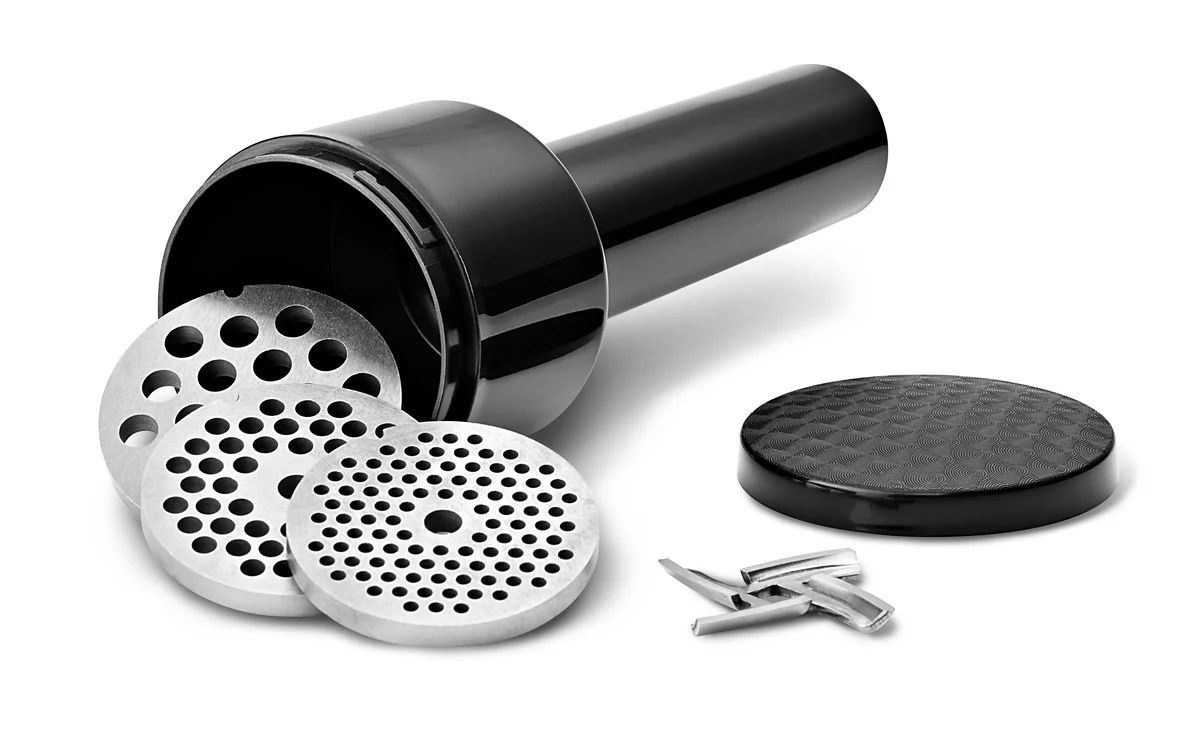 - Аксессуары: 1 нож из нержавеющей стали, 3 формовочных диска (диск для мелкой рубки, диск для средней рубки, диск для крупной рубки), 1 насадка для домашней колбасы, 1 насадка кеббе, толкатель