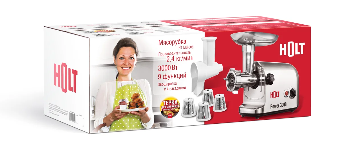 - Аксессуары: Мясорубка: 3 формовочных диска (диск для мелкой рубки, диск для средней рубки, диск для крупной рубки), 1 насадка для домашней колбасы, 1 насадка Кеббе