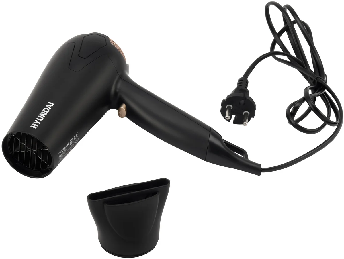 Задняя защитная решётка фена для удобства снимается. Шнур питания данной модели защищен от перекручивания, а у его основания расположена петля для подвешивания в вертикальном положении. Длина провода составляет 1,8 м, поэтому Hyundai H-HDI0755 комфортно пользоваться даже на удалении от розетки. А благодаря скромным габаритным размерам и небольшому весу данную модель можно брать с собой в командировки и длительные путешествия в качестве дорожного фена.