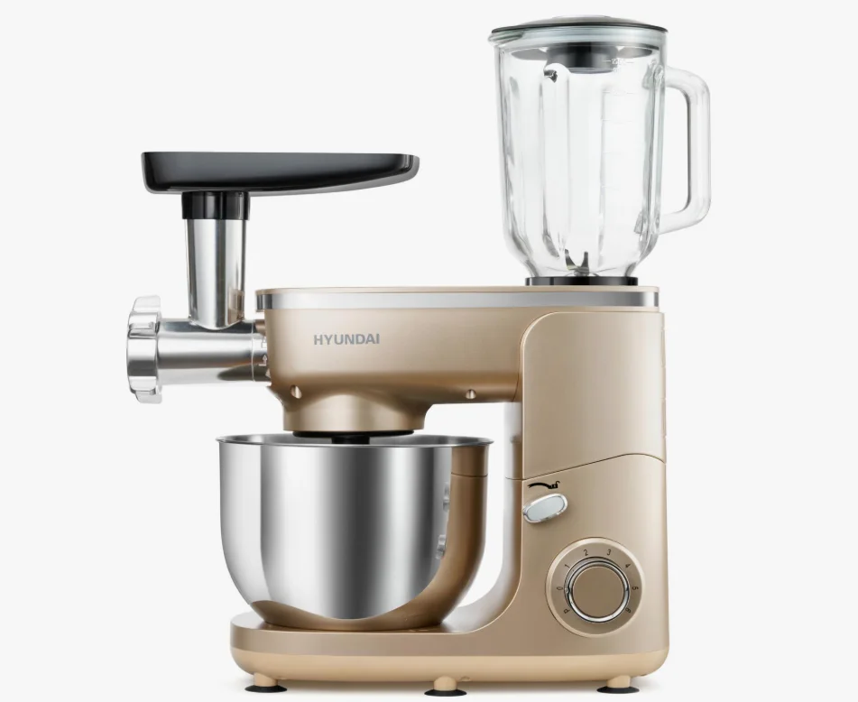 Кухонная машина Hyundai HYMS7451 планетар.вращ. 1400Вт золотистого цвета — многофункциональное устройство, которое объединяет в одном корпусе функционал мясорубки, блендера и перемешивателя теста.