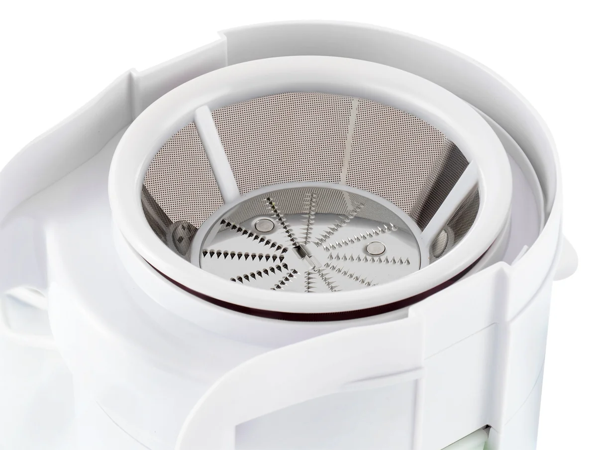 Устройство сочетает в себе лёгкий корпус, выполненный из качественно пластика, и сетку для фруктов из нержавеющей стали. Материалы, из которых выполнена данная модель, устойчивы к коррозии.
