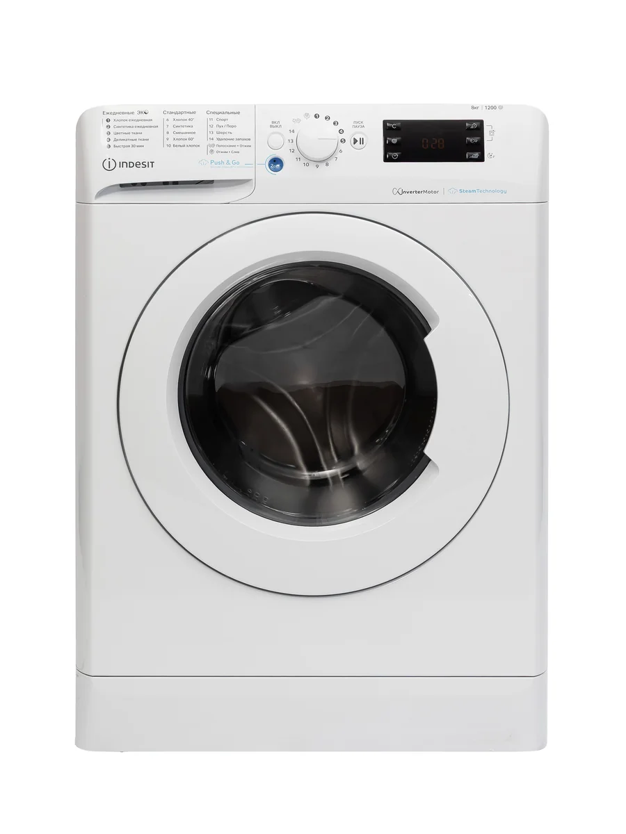 - функции: Push&Go Steam, отложенный запуск, выбор температуры, пятна, выбор скорости отжима, индикатор заблокированного люка, индикация стирки/полоскания/отжима/слива, защита от детей.