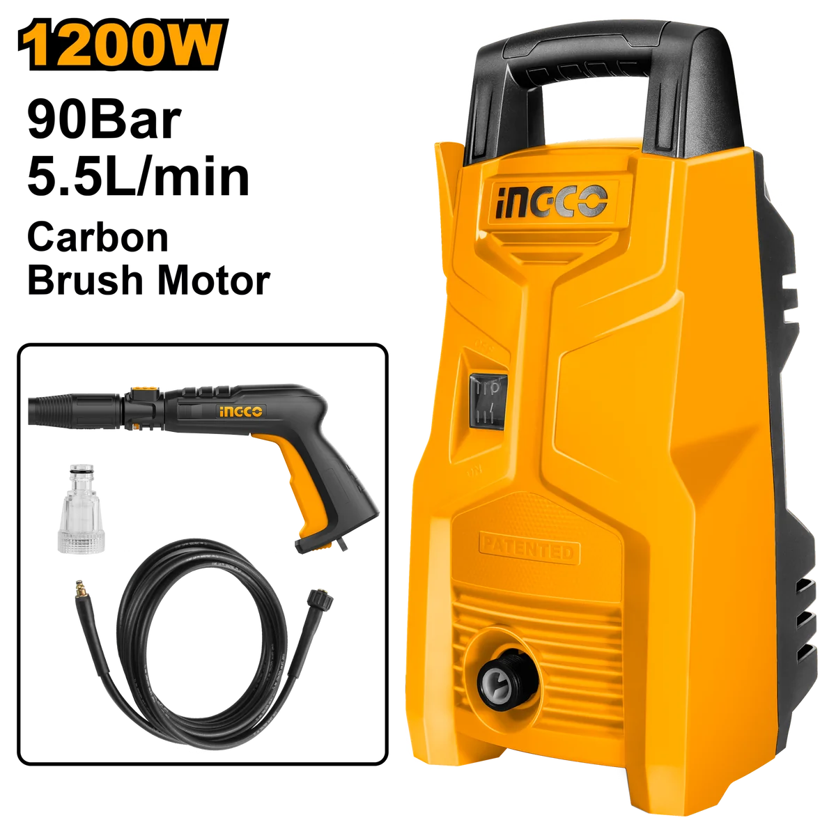 Мойка высокого давления INGCO HPWR12008 — компактная и надёжная модель для очистки тротуаров, дорожек, фасадов, садовой мебели и других поверхностей.