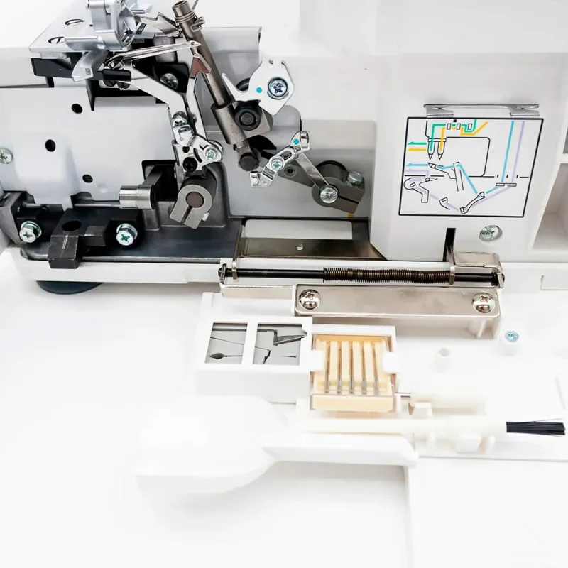 Оверлок Jaguar 065D с запатентованными системами облегченной заправки нитей в петлители и заправки нитей в иглы. Для ниток и обрезков ткани у оверлока предусмотрен мусоросборник. Также для удобства работы в вечернее время или в помещениях с недостаточной освещённостью модель оборудована встроенной подсветкой. Оверлок поставляется с широким набором дополнительных аксессуаров, включая мягкий чехол.