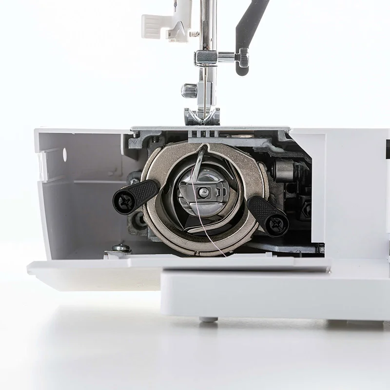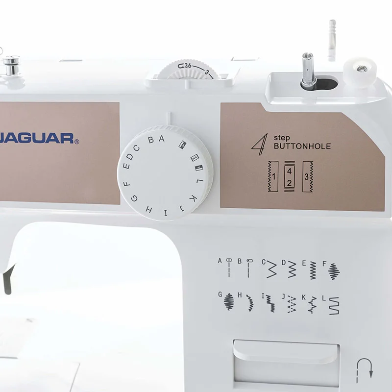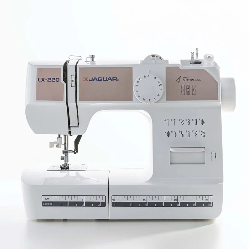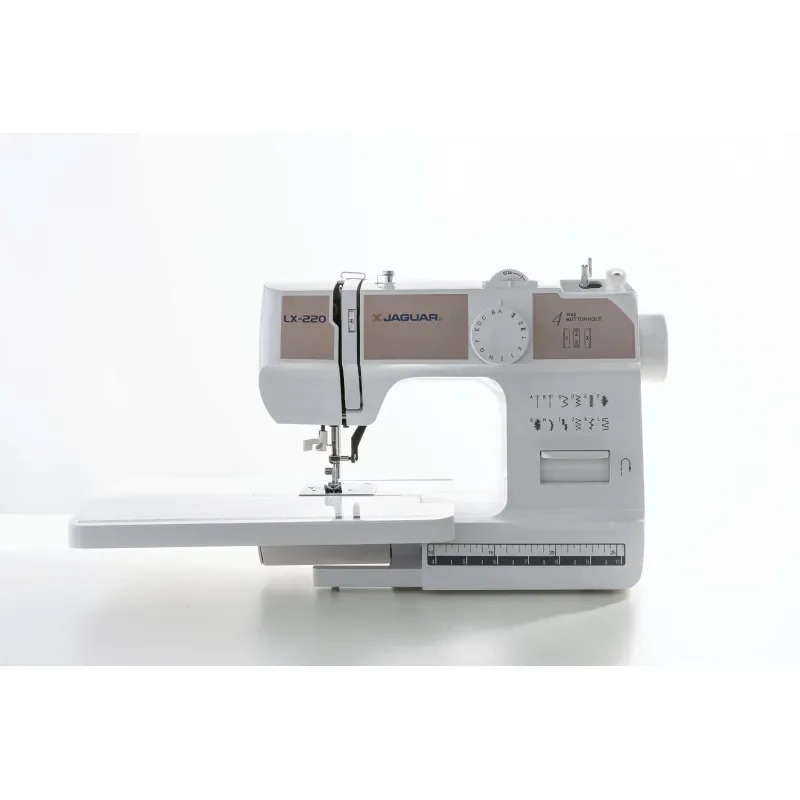 Jaguar LX-220 - компактная электромеханическая швейная машина, созданная для максимального удобства при каждом использовании. Она сконструирована на базе металлической станины с применением надежных металлических узлов и деталей и оснащена проверенным временем вертикальным качающимся челноком. Машина выполняет все основные необходимые для работы строчки - прямые, зигзаги, эластичные, потайные, имитацию оверлочной строчки и шитье двойной иглой. С ее помощью вы также сможете сделать красивую и аккуратную петлю и пришить пуговицу. Яркое светодиодное освещение рабочей поверхности позволяет экономить мощность и не думать о замене лампочки в самый неподходящий момент. Швейная машина Jaguar LX-200 оснащена заправщиком нити в иглу, а на ее корпусе предусмотрен обрезчик нити. Широкий приставной столик, поставляющийся вместе с машиной, позволяет значительно увеличить рабочую поверхность шитья.