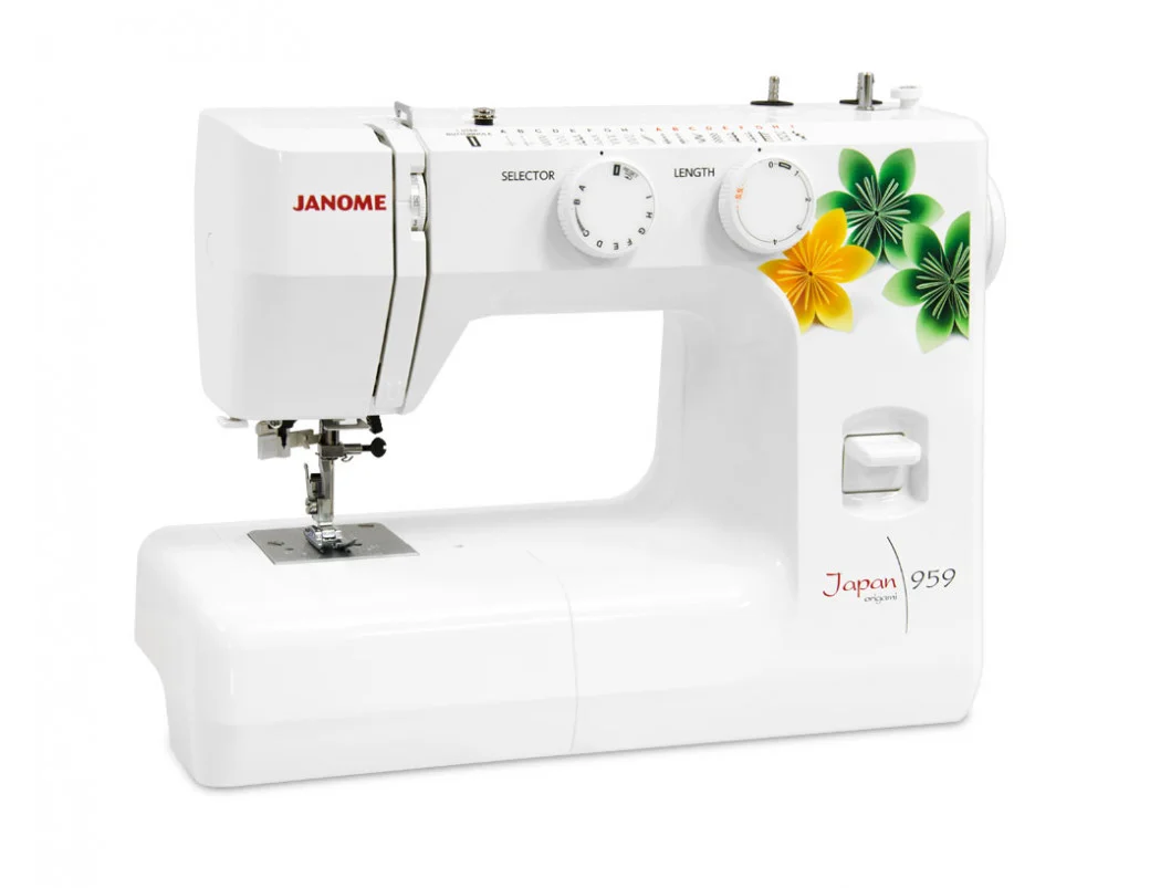 Швейная машина Janome Japan 959 выполняет 19 видов строчек и петлю в автоматческом режиме. Машина хорошо справляется с различными типами тканей. Достаточная функциональность швейной машины Janome Japan 959 для использования ее не только для ремонта одежды, но и для пошива изделий из различных тканей и материалов, прошивает все виды тканей: легкие, средние, плотные.