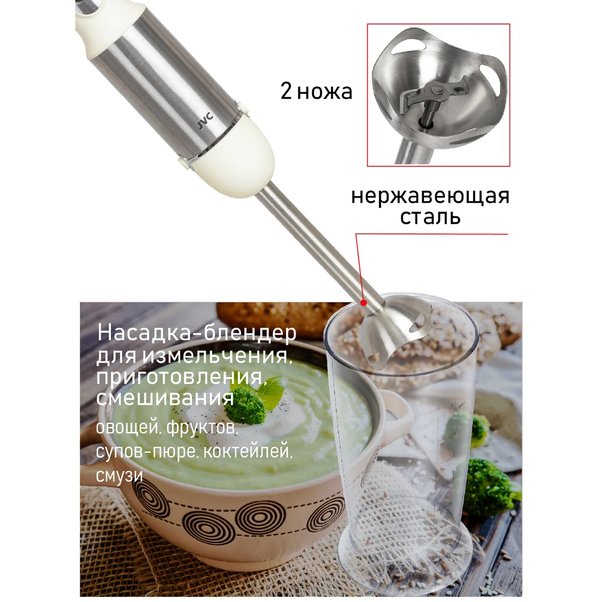| Насадки | съемная насадка-блендер с двойным лезвием из нержавеющей стали, съемная насадка-венчик из нержавеющей стали |
