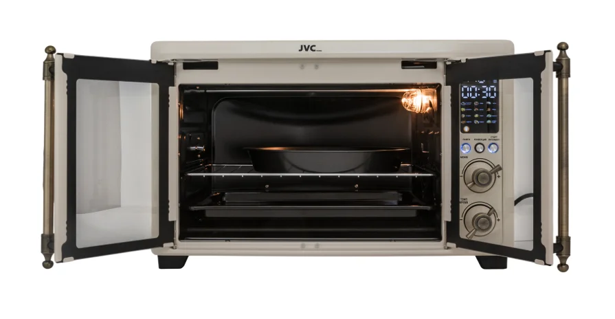 электропечь, металлическая решетка, плоский противень, ухват для противня, круглый противень для пиццы, вертел для гриля, ухват для вертела, насадка для приготовления шашлыка/кебаба, поддон для крошек, воздушная корзина, корзина для жарки, гарантийный талон, инструкция на русском языке