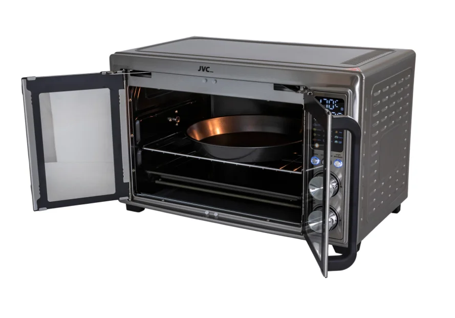электропечь, металлическая решетка, плоский противень, ухват для противня, круглый противень для пиццы, вертел для гриля, ухват для вертела, насадка для приготовления шашлыка/кебаба, поддон для крошек, воздушная корзина, корзина для жарки, гарантийный талон, инструкция на русском языке