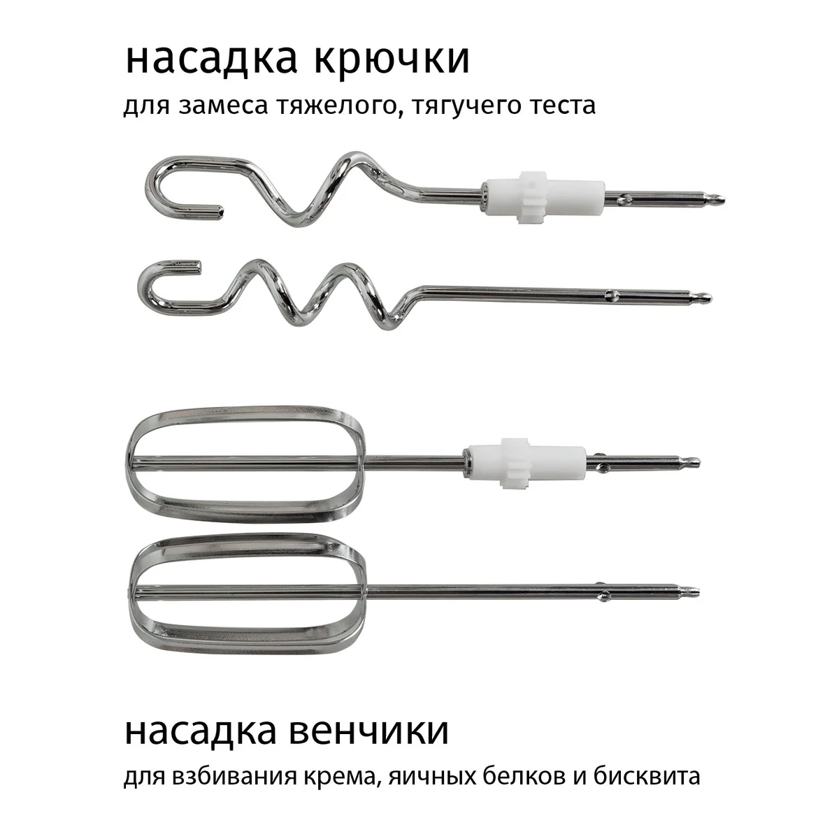 | Насадки | венчики для взбивания яиц и крема, крючки для замеса теста |