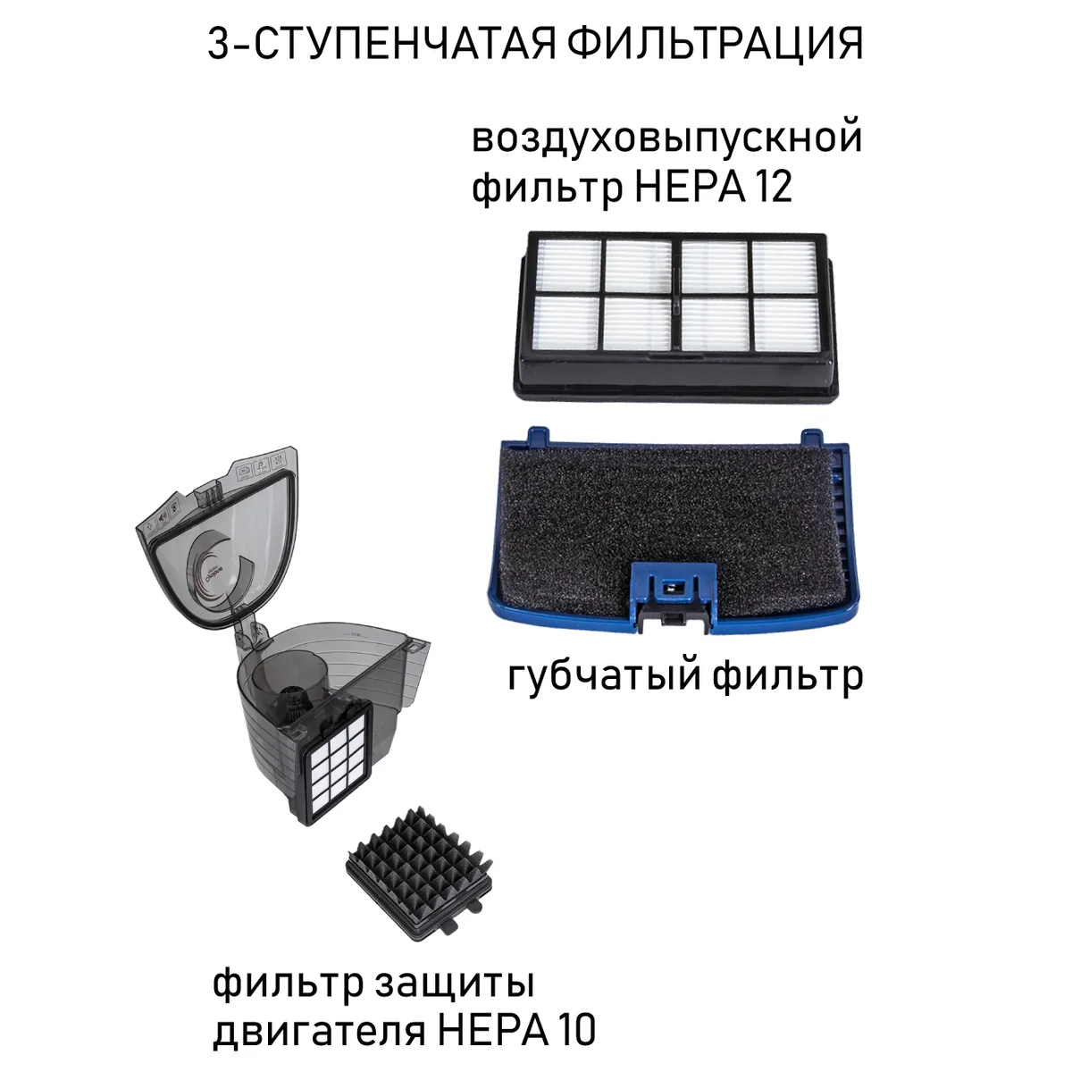 | Система фильтрации | 3-уровневая: фильтр HEPA 12, фильтр HEPA 10, губчатый фильтр |