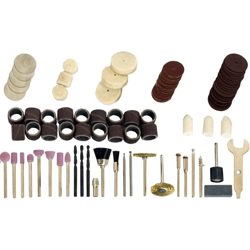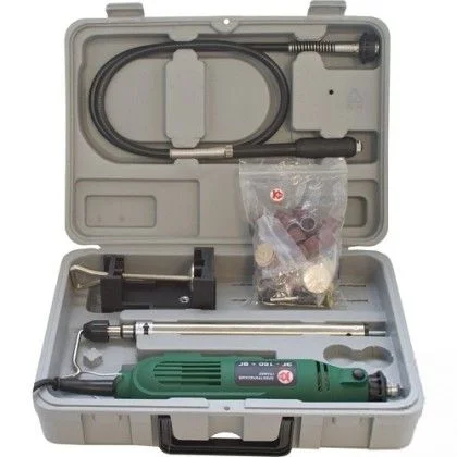 В зависимости от типа обрабатываемого материала (стекла, стали, алюминия, кожи, меди, дерева, АБС пластика, керамики, стеклотекстолита, полистирола и т.п.), на гравер может быть установлена одна из 160 насадок, имеющихся в комплекте. В частности, в штатный набор входят различные спиральные свёрла, корундовые и твердосплавные отрезные диски, полировальные приспособления, щётки, шлифовальные барабаны, фрезы, шарошки, точила и алмазные боры. Дополнительное удобство мастеру создают эргономичная стойка и гибкий вал. Электродвигатель защищён от перегрева усиленной изоляцией. Весь комплект упакован в специальный пластиковый кейс.