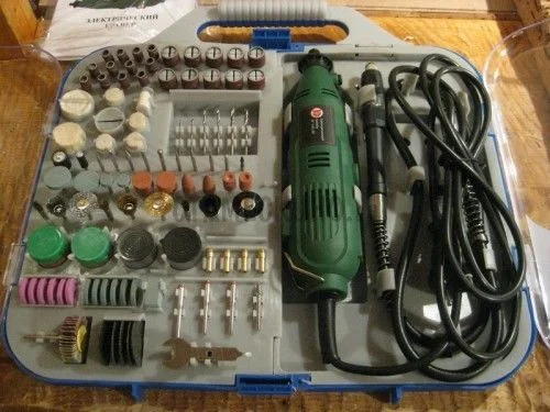 Набор принадлежностей – 100 предметов : полировальные насадки, металлические, корундовые отрезные диски, шлифовальные диски, барабаны, камни, щетки, фрезы, алмазный бор, сверла.