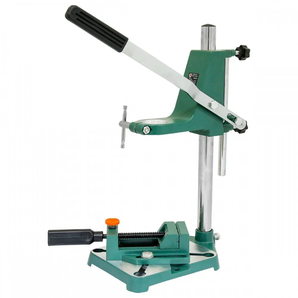 Стойка для дрели Калибр артикул 96203 с тисками используется для работы с дрелью без удерживания дрели в руках. С помощью стойки производят вертикальное закрепление инструмента. Стойку можно зафиксировать на поверхности стола при помощи болтов. В комплекте предусмотрены тиски, с помощью которых фиксируют различные заготовки