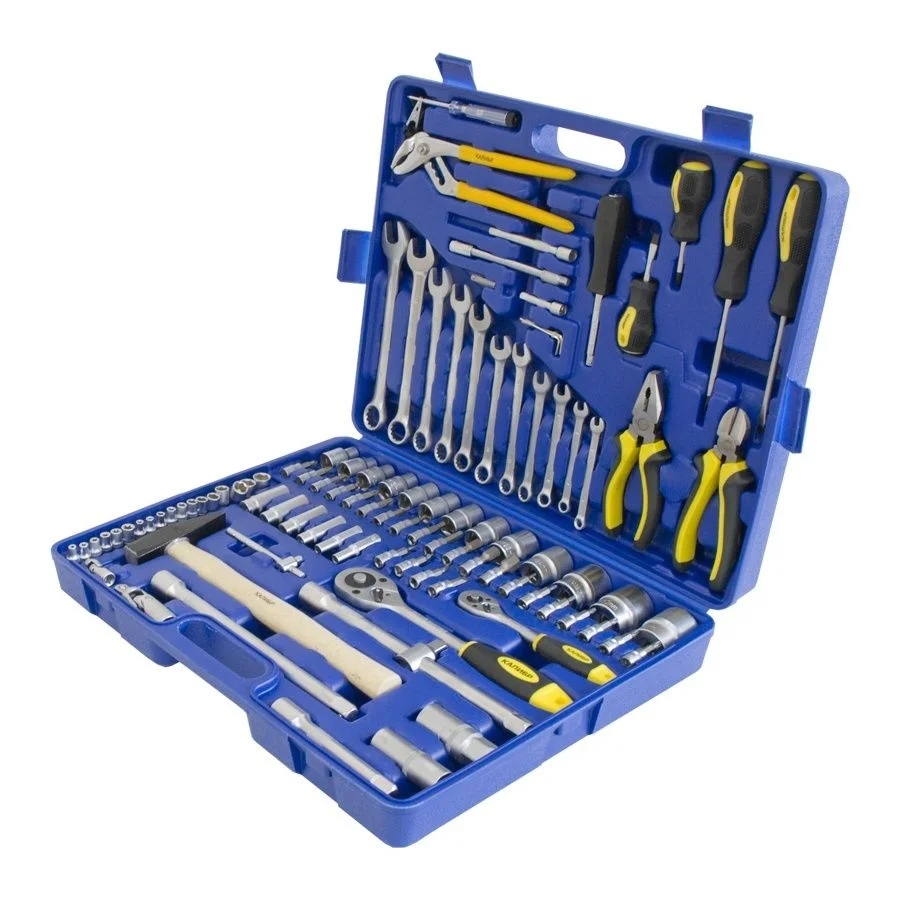 В комплекте представлены ключи разного диаметра, насадки, отвертки, пассатижи, кусачки, торцевые головки с шестигранным рабочим профилем. Также здесь имеются специальные ключи с присоединительными квадратами ? и ?. Все отвертки и кусачки из прочной стали оснащены удобными рукоятками. Грамотная комбинация инструментов позволит эффективно использовать их как в частных ремонтных работах, так и на производстве.