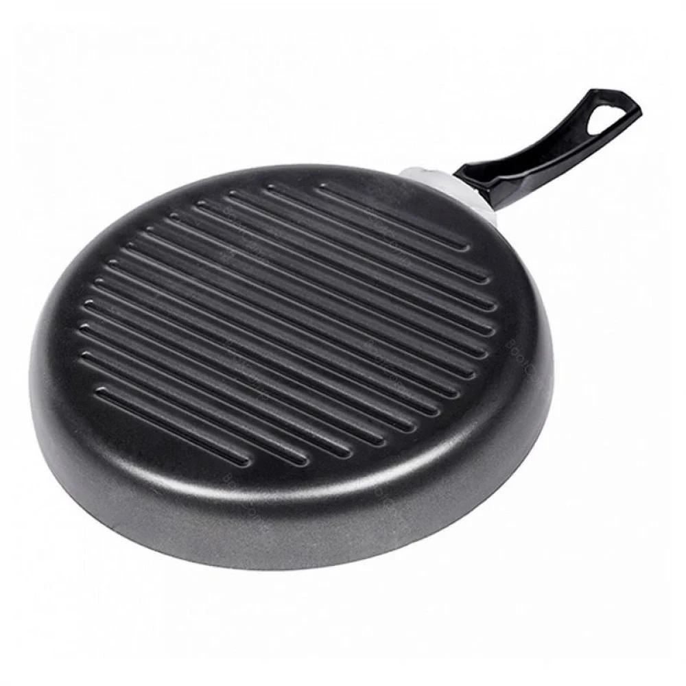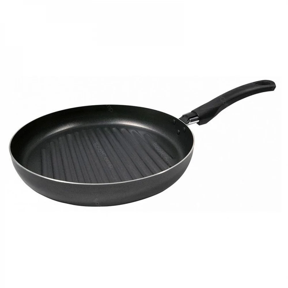 Практичная и удобная сковорода-гриль диаметром 26 см в популярной линейке посуды с антипригарным покрытием по доступной цене. Прочный корпус из штампованного алюминия нагревается быстро и равномерно, рифленое дно исключает прилипание пищи даже с минимальным использованием масла. Европейское антипригарное покрытие протестировано на износостойкость, не содержит вредных примесей и абсолютно безопасно. Внешнее декоративное покрытие легко моется и долго сохраняет свой строгий и насыщенный черный цвет. Сковорода идеально подходит для жарки стейков из рыбы и мяса, овощей и закусок на газовой или электрической плите.