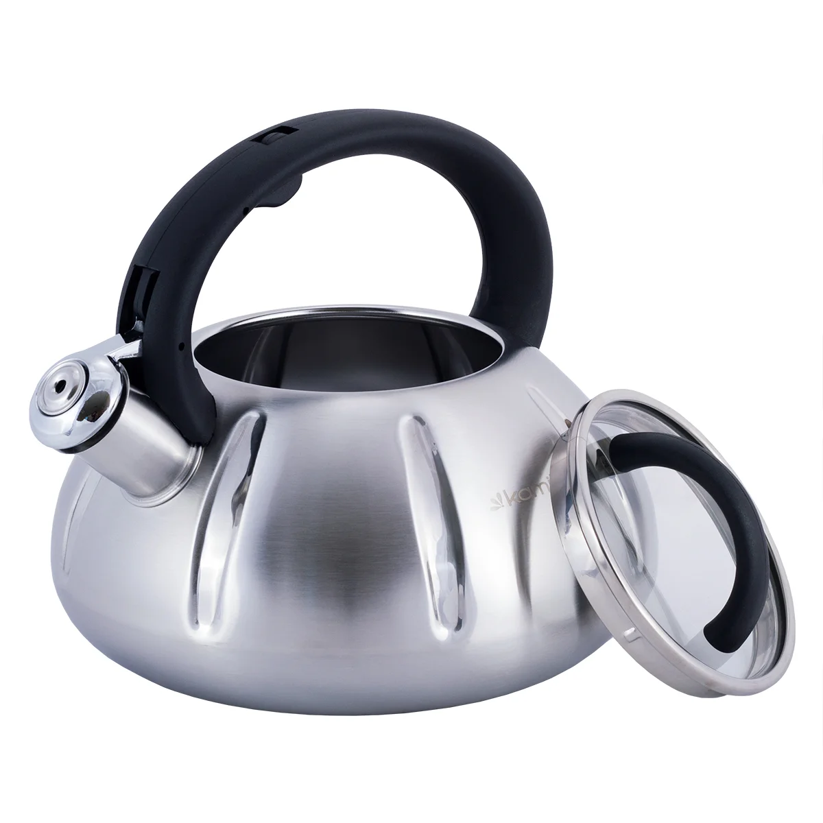 Чайник Kamille KM-0671A (3 л.) из нержавеющей стали со свистком и стеклянной крышкой (черная ручка)