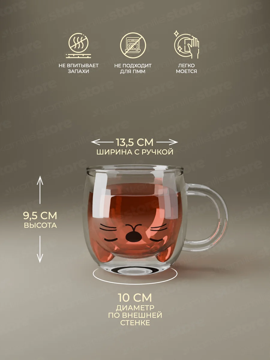 Чашки с двойными стенками из стекла Kamille – изящные и легкие. Корпус полностью изготовлен из боросиликатного стекла, что дает повышенную термостойкость и механическую прочность, материал безопасен для здоровья, красив и надежен. По сути, это две чаши одинаковой формы, но разного размера, вставленные одна в другую и соединенные по верхнему краю. С виду кажется, что внутренняя часть как будто парит над столом, а вместе с ней напиток. Это красиво и необычно. Используется как дизайнерский прием в сервировке праздничного стола, в кафе и ресторанах, и благодаря оригинальному внешнему виду посуда с двойными стенками станет отличным подарком для любого повода.