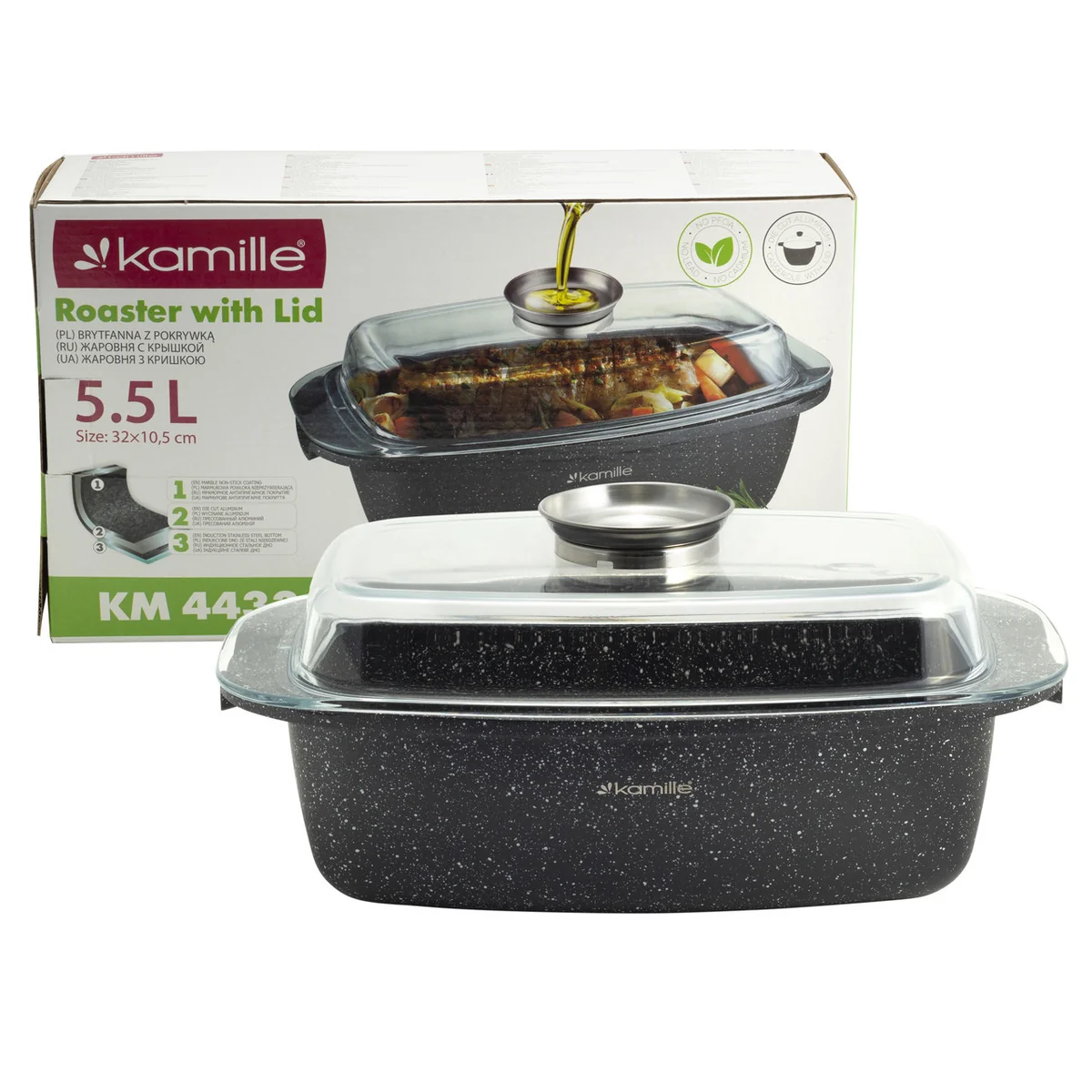 Гусятница из литого алюминия с антипригарным покрытием и стеклянной крышкой Kamille KM-4433 имеет достаточно большой размер, в нее можно положить целого гуся, приготовить повседневное или праздничное горячее блюдо на шесть – двенадцать человек. Этот вид посуды отлично подходит для большой семьи, или для тех, кто любит большие компании, часто принимает гостей.