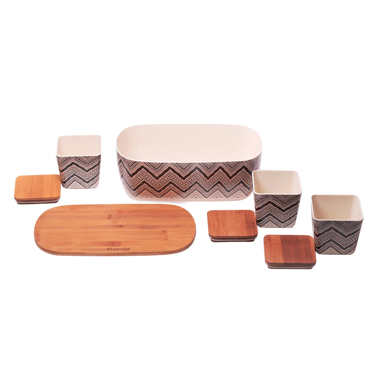- Материал хлебницы и емкостей: бамбуковое волокно - 65 %, кукурузное волокно - 15%, меламин - 20%.