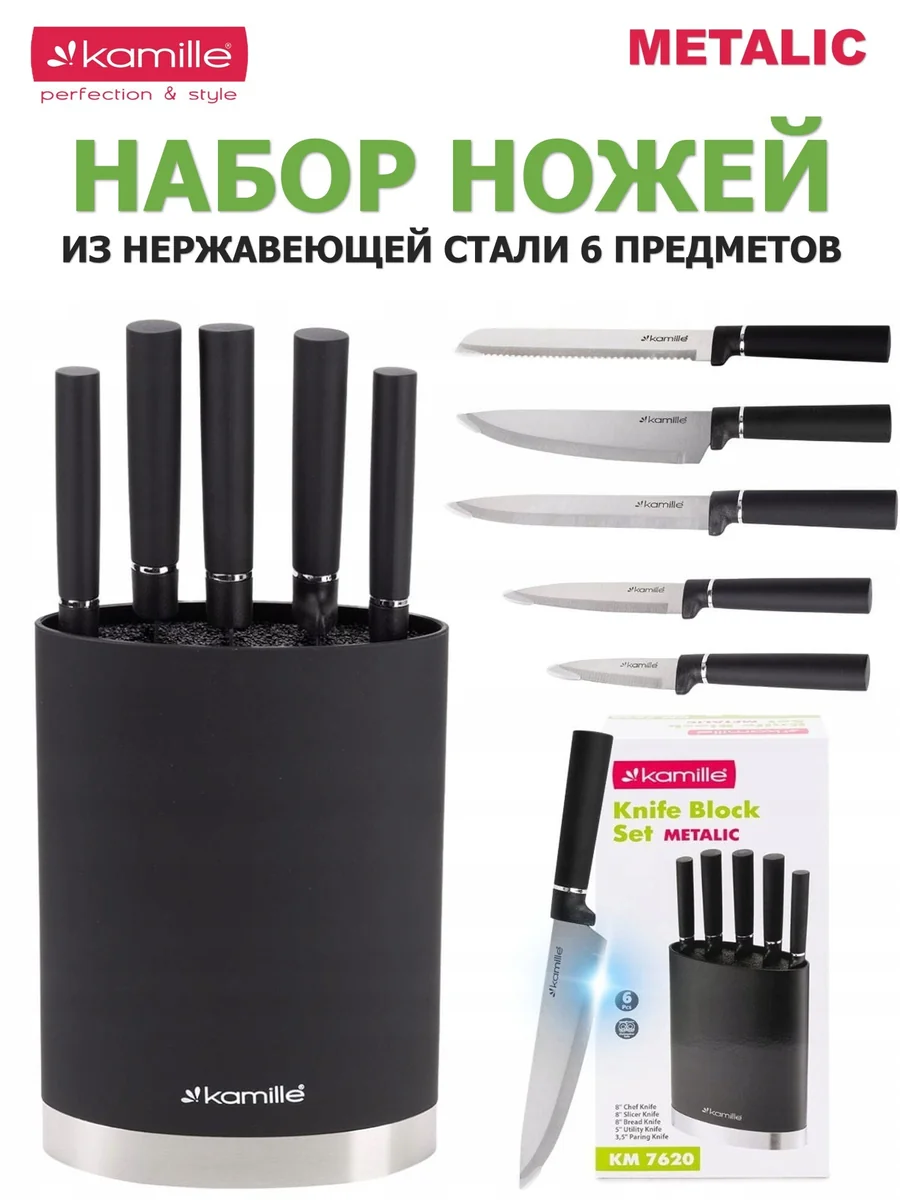 Набор кухонных ножей Kamille создан по самым современным и модным технологиям и тенденциям, он понравится даже у самому требовательному покупателю, добавит неповторимость в интерьере и станет украшением на Вашей кухне.