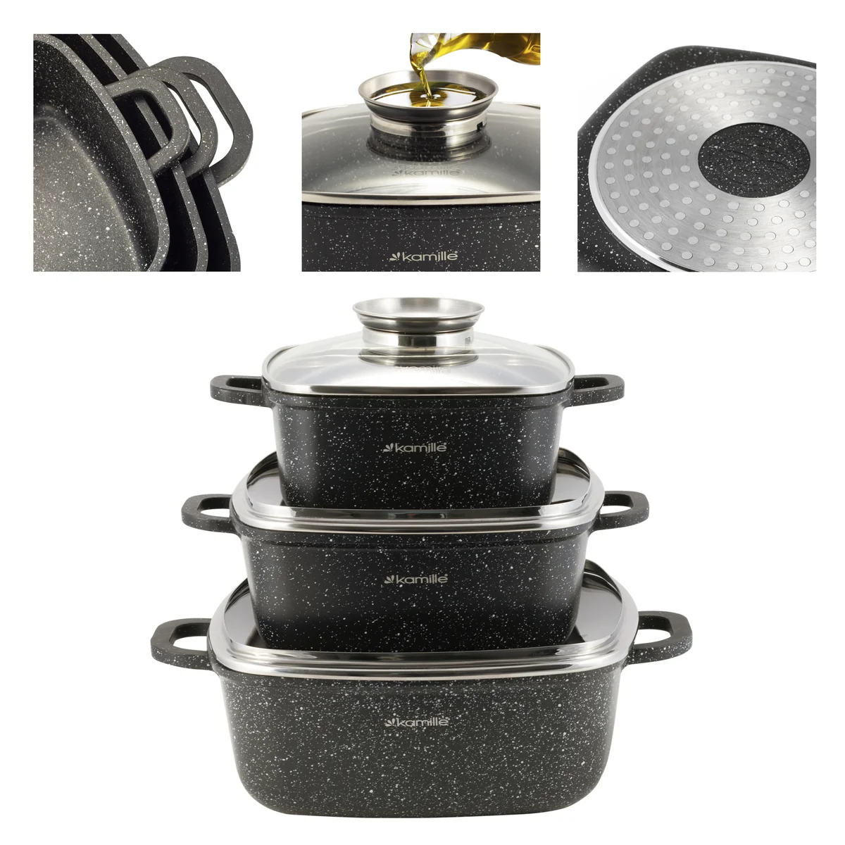 Набор посуды 7 предметов (кастрюли квадратные 20 см, 24 см, 28 см, прихватки 2 шт) Kamille KM-4435 из литого алюминия