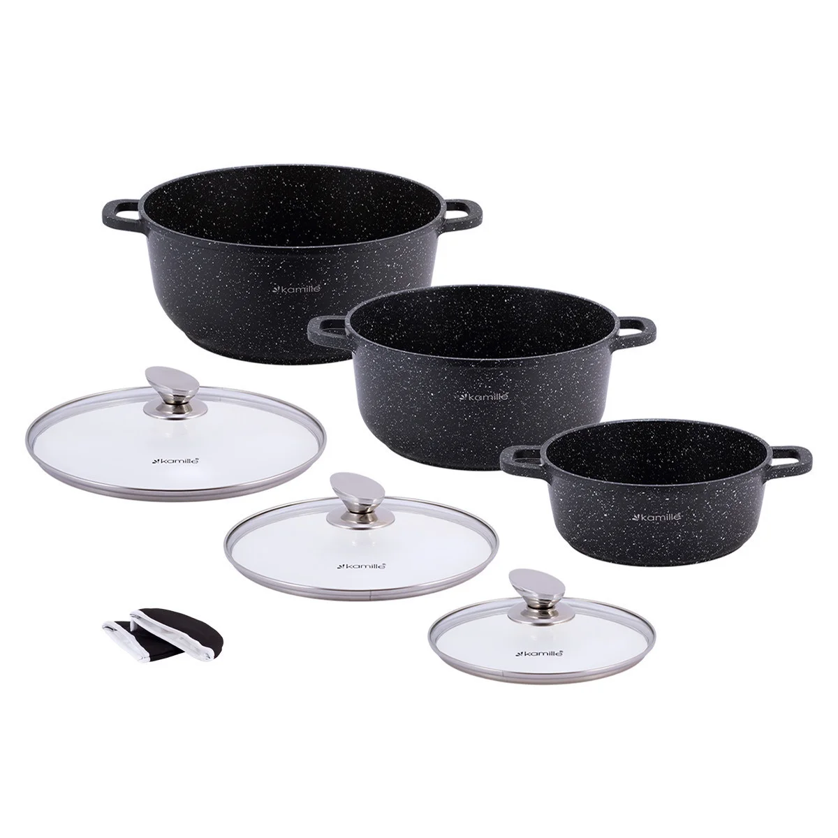Набор посуды 7 предметов Kamille KM-4430 из литого алюминия (кастрюли 2,3 л; 4,5 л; 6,5 л; прихватки 2 шт.)