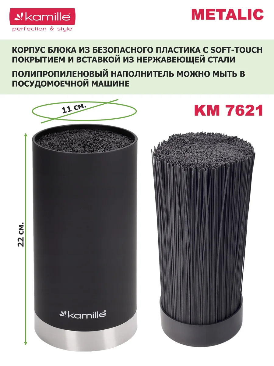 Универсальная блок-подставка для ножей с наполнителем Kamille, позволяет максимально бережно хранить кухонные ножи и ножницы в одном месте, так чтобы они всегда были под рукой. Корпус подставки выполнен из прочного и безопасного пищевого пластика, с приятным на ощупь и глазу покрытием soft-touch. Внутренний блок состоит из тонких и гибких полипропиленовых стержней, которые не вредят лезвиям. При необходимости наполнитель свободно вынимается и моется в посудомоечной машине. Такой держатель подходит как для обычных металлических, так и для керамических ножей и не даст им затупиться, а главное поможет вам держать все ваши любимые инструменты под рукой! Порадуйте себя и своих близких красивым, универсальным и главное - полезным подарком!