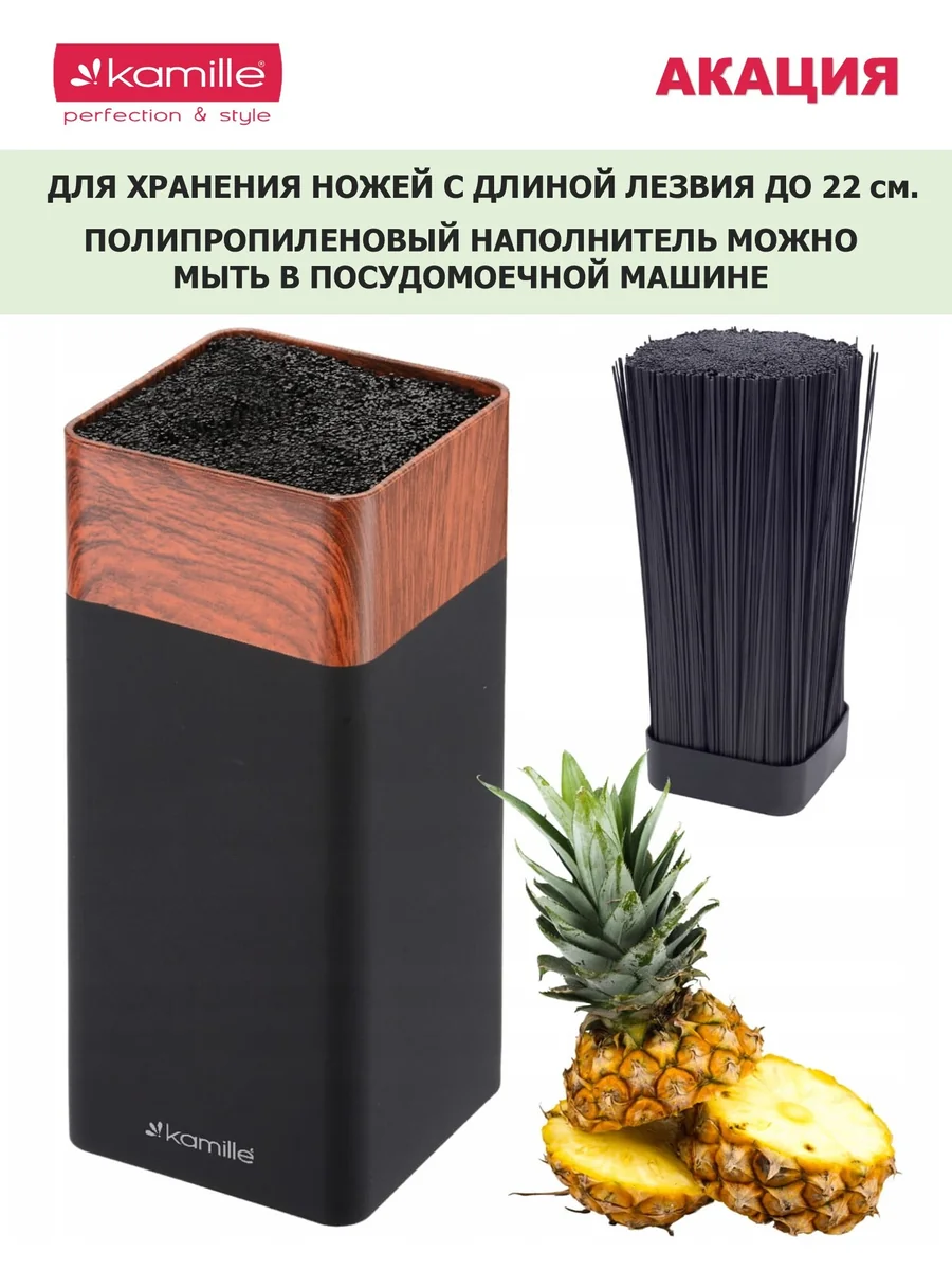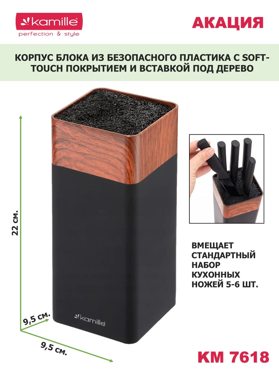 Универсальная блок-подставка для ножей с наполнителем Kamille, позволяет максимально бережно хранить кухонные ножи и ножницы в одном месте, так чтобы они всегда были под рукой. Корпус подставки выполнен из прочного и безопасного пищевого пластика, с приятным на ощупь и глазу покрытием soft-touch. Внутренний блок состоит из тонких и гибких полипропиленовых стержней, которые не вредят лезвиям. При необходимости наполнитель свободно вынимается и моется в посудомоечной машине. Такой держатель подходит как для обычных металлических, так и для керамических ножей и не даст им затупиться, а главное поможет вам держать все ваши любимые инструменты под рукой! Порадуйте себя и своих близких красивым, универсальным и главное - полезным подарком!