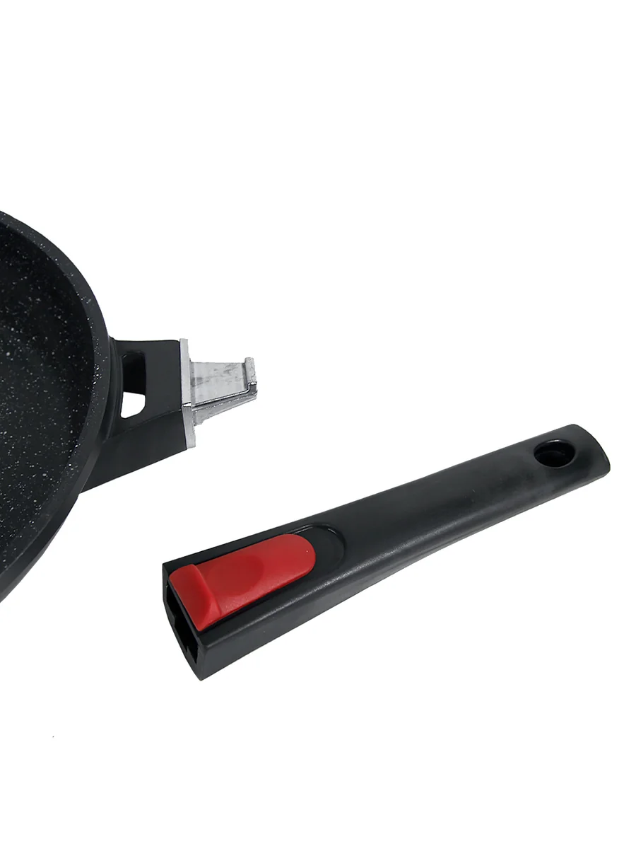 Сковорода изготовлена из литого алюминия, благодаря чему у нее отличные теплопроводность и теплоаккумулирующие свойства. Прочное антипригарное покрытие абсолютно безопасно для здоровья человека, не содержит PFOA, свинца и кадмия и гарантирует долгий срок службы посуды даже при ежедневном использовании. Сковорода со снятой ручкой не займет много места при хранении.