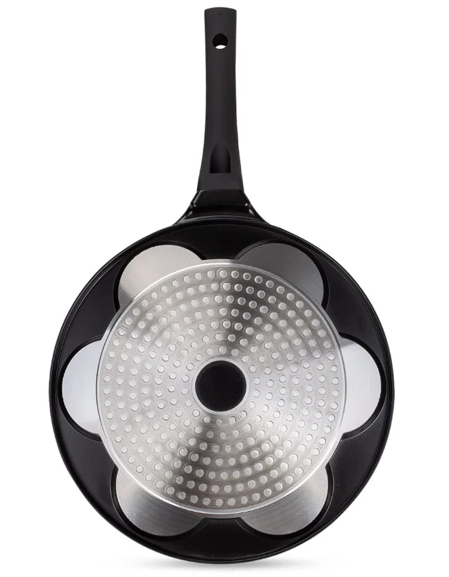 Корпус сковороды изготовлен из прочного литого алюминия, обеспечивая равномерное распределение тепла, что делает процесс готовки быстрым и легким.