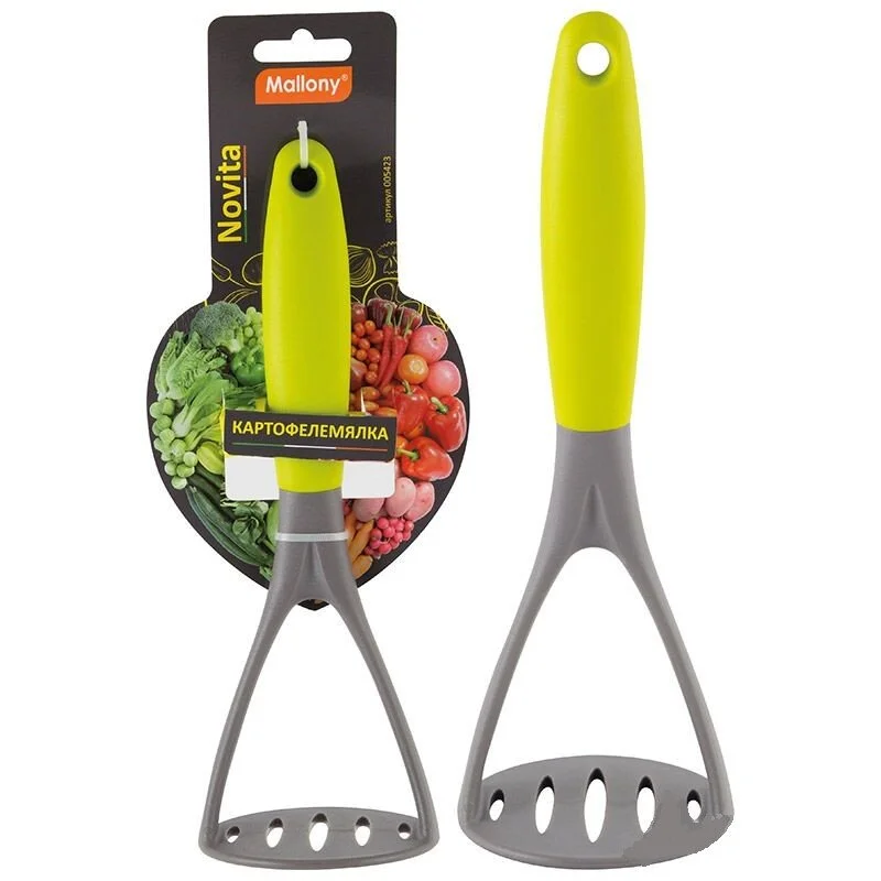 Картофелемялка (толкушка) из нейлона с цветной ручкой из TPR, серия Novita, тм Mallony Цвет ручки - зеленый, цвет рабочей части - серый. Материалы: нейлон, TPR Размер: 8,3*24,5 (высота) см Упаковка: цветная подложка. Предназначена для измельчения вареных овощей.