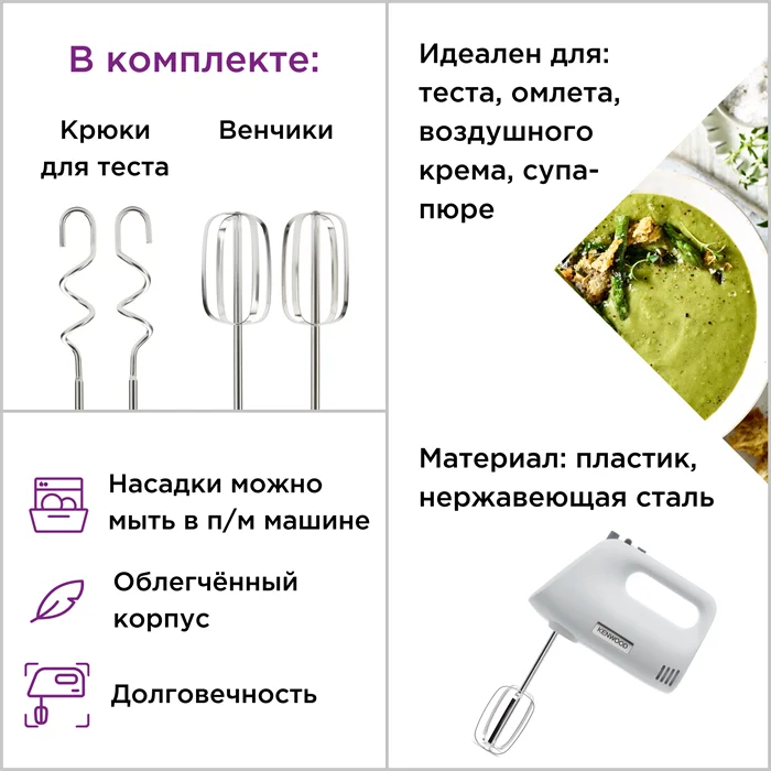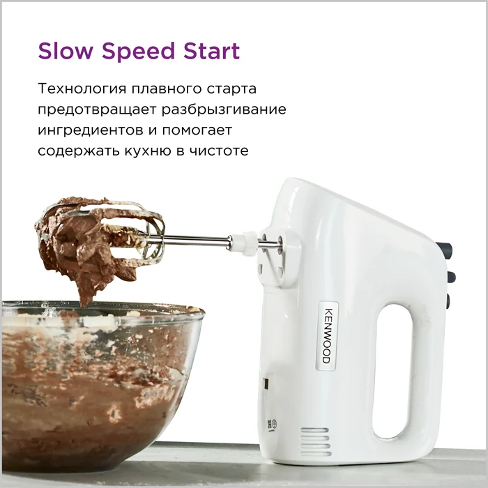 ПОМОЩНИК НА КАЖДЫЙ ДЕНЬ Для приготовления простых повседневных блюд возможности продвинутой современной техники вроде кухонных комбайнов или кухонных машин могут оказаться избыточными. В самом деле, вряд ли вы станете использовать эти устройства, чтобы банально взбить пару яиц для омлета. Но и полностью полагаться на ручную работу – тоже не лучший вариант. Прибор классического дизайна со стандартными функциями отличается небольшими размерами, малым весом (легкий, но прочный корпус из белого пластика) и очень удобен в обращении. Мотор мощностью до 450 Ватт имеет 5 скоростей и дополнительный режим «турбо». СМЕННЫЕ НАСАДКИ Для взбивания и смешивания ингредиентов миксер оснащается двумя парами сменных насадок. Это металлические венчики или крюки для теста. Первые отлично справляются с «легкими» смесями, вроде жидкого блинного теста или яиц, а вторые подходят для замешивания теста средней плотности. Причем для большей эффективности рекомендуется замешивать тесто на пониженной скорости, а режим «турбо» использовать кратковременно и только для продуктов соответствующей консистенции. Например, при создании воздушного крема. ПОЛНЫЙ КОНТРОЛЬ Миксер Kenwood HMP 30.A0 WH Lite изначально разрабатывался предельно простым, что, однако, не снижает его достоинств. Прибор можно спокойно держать в одной руке и контролировать режимы работы в прямом смысле тоже одним пальцем. Именно для этого рычажок переключения скоростей и кнопка, отсоединяющая насадки, расположены прямо под пальцами на рукоятке. Обратите внимание, что несмотря на такой способ подключения насадок, они надежно закреплены в пазах во время работы и не могут случайно выскочить даже на максимальных оборотах.